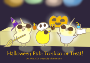 2022年11月8日は皆既月食&惑星食が見えたのではないでしょうか。イラストは、流行りものが好きなオカメさんが小鳥仲間と皆既月食&惑星食を見ている様子です。街中だと建物があってなかなか見えないのが悩ま