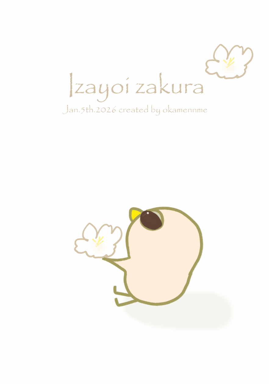イラストは、ふわふわと落ちてきた十六夜桜を見つめるピンクのインコさんです