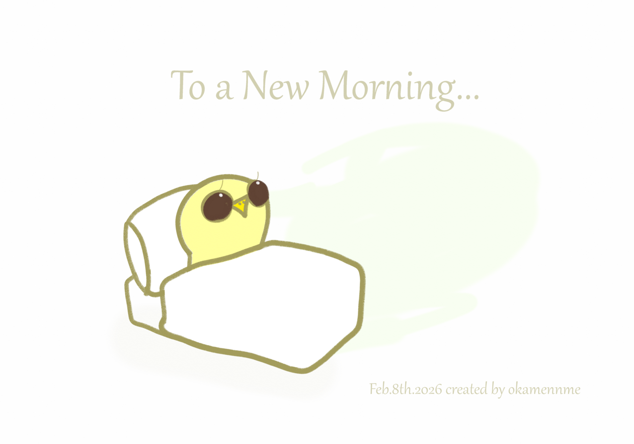 イラストは目が覚めてからベッドの上でしばしぼーっとするセキセイインコさんです
