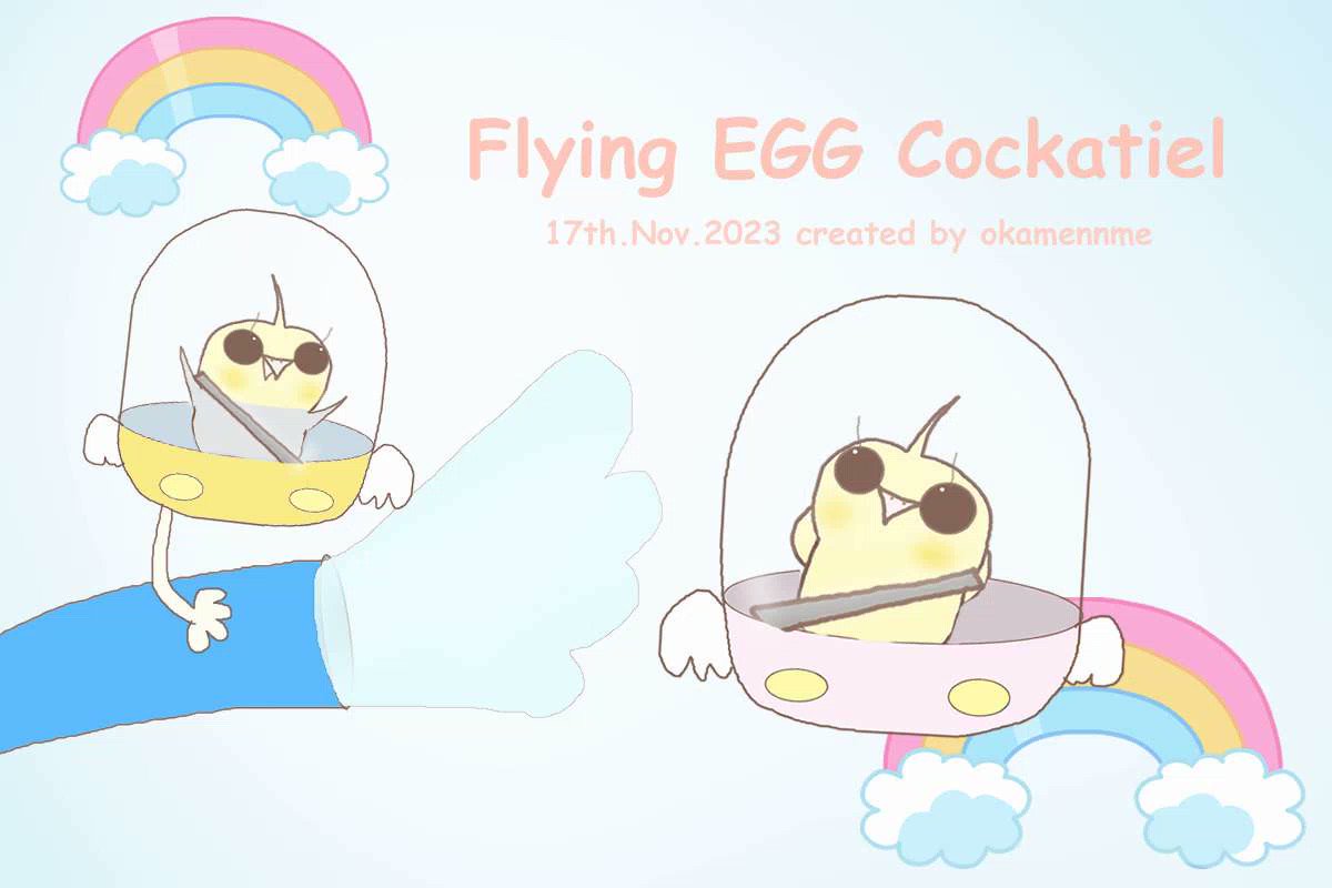 The illustration depicts a calm Cockatiel leisurely riding on a flying egg.