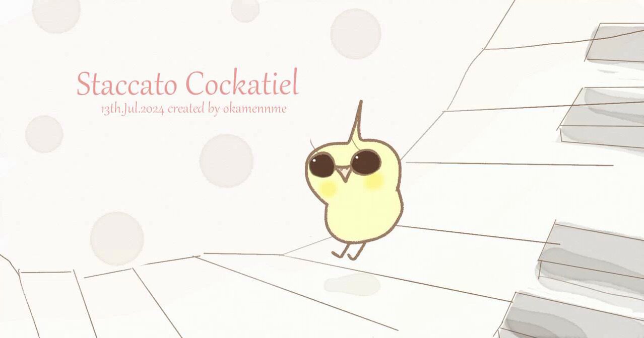 The illustration features Okame-san hopping on the piano keys in staccato.