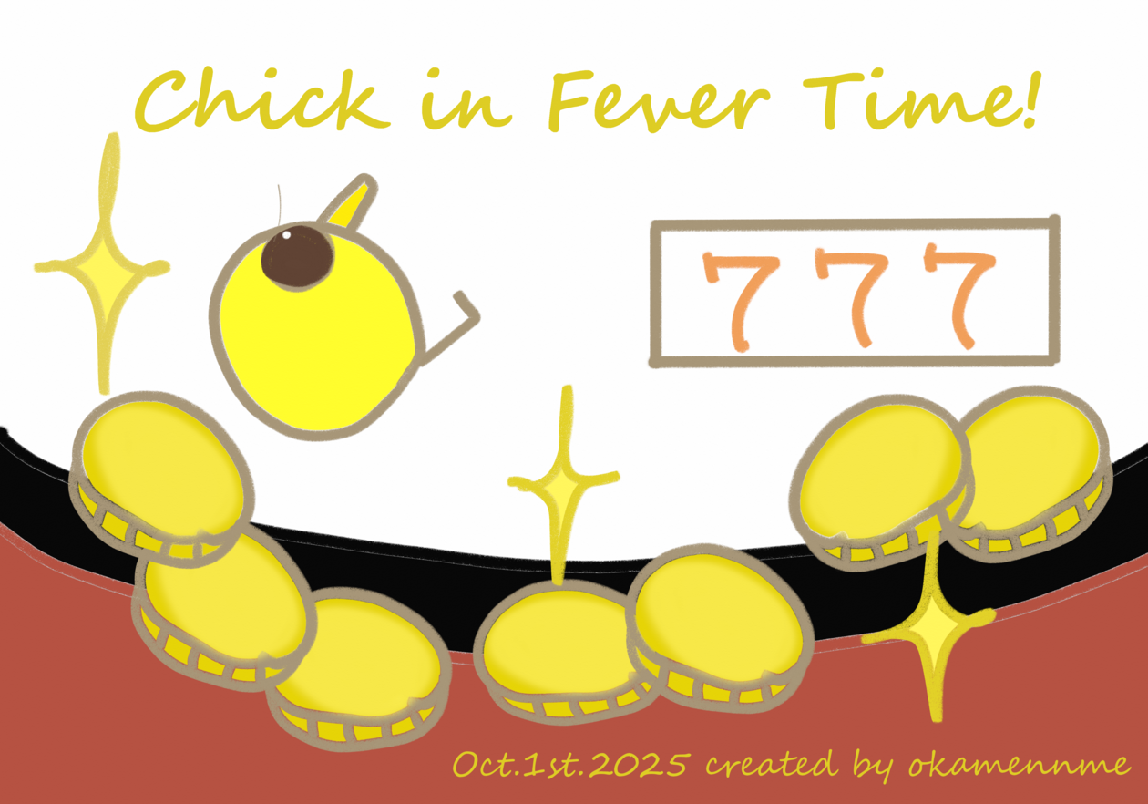 深夜の2時間DTMお題:フィーバータイム!のBGMイラストは、スロットのフィーバータイムに入ったひよこちゃんですあらあら コインとひよこちゃんの区別がつかなくなりそうですピアノとブラスセクションにドラ