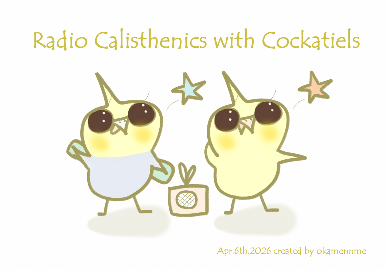 The illustration shows cockatiels enthusiastically doing their “radio calisthenics”… maybe?