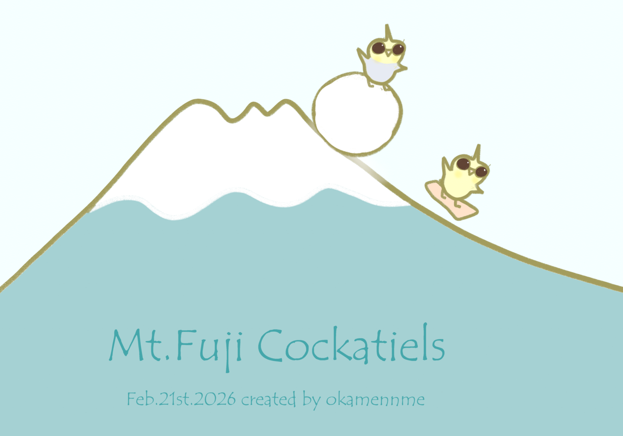The illustration boldly features cockatiels enjoying winter sports (?) on Mt. Fuji.